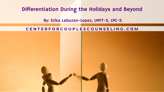 Couples struggle with differentiation on a regular basis, and therefore it is something we work on often in couples therapy. I once heard on a podcast that the most practiced differentiated person can become instantly undifferentiated when walking into Thanksgiving dinner. So imagine adding relationship dynamics to family of origin issues, and you can see how easy it is to lose yourself in the mix. I encourage you to use these strategies with your partner and practice each skill in couples therapy as the holiday season becomes closer and closer.